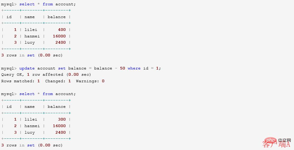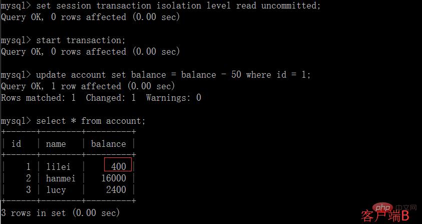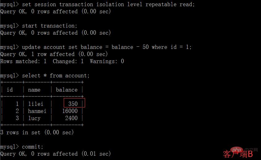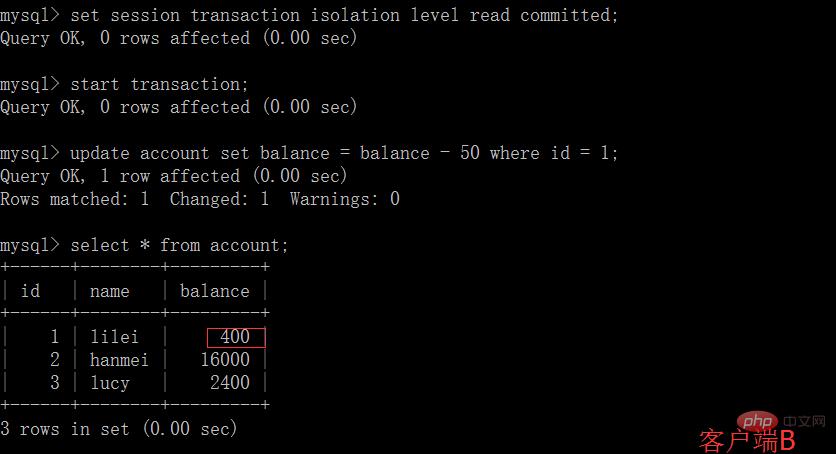 (5)在客户端A执行更新语句update account set balance = balance - 50 where id =1,lilei的balance没有变成350,居然是400,是不是很奇怪,数据不一致啊,如果你这么想就太天真 了,在应用程序中,我们会用400-50=350,并不知道其他会话回滚了,要想解决这个问题可以采用读已提交的隔离级别
