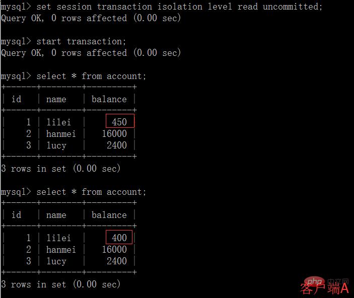 (1)打开一个客户端A,并设置当前事务模式为read uncommitted(未提交读取),查询表account的初始值: