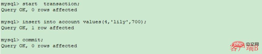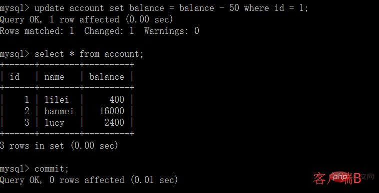(2)在客户端A的事务提交之前,打开另一个客户端B,更新表account并提交