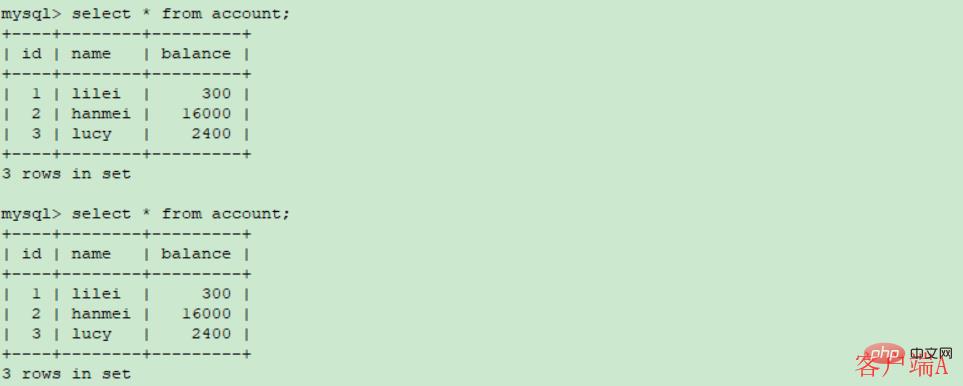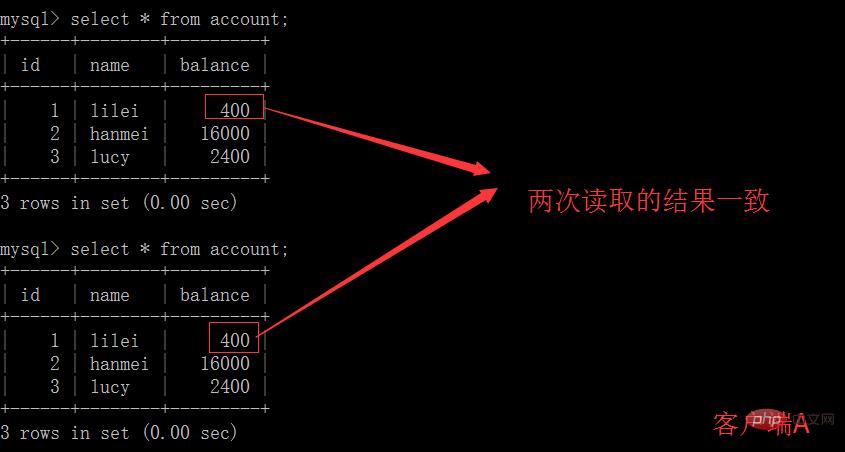 (3)在客户端A查询表account的所有记录,与步骤(1)查询结果一致,没有出现不可重复读的问题