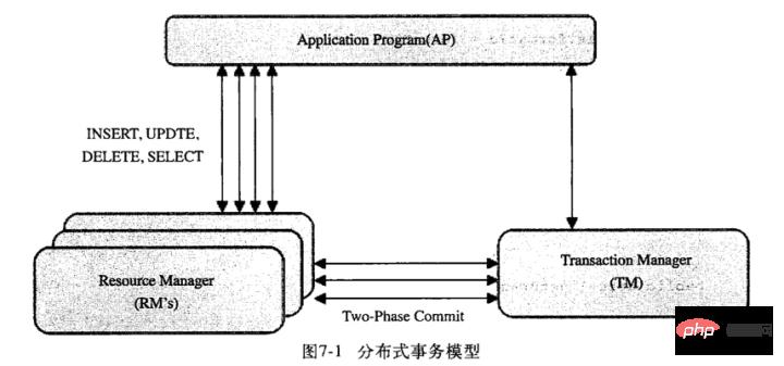如图,mysql的分布式事务模型。模型中分三块:应用程序(AP)、资源管理器(RM)、事务管理器(TM):