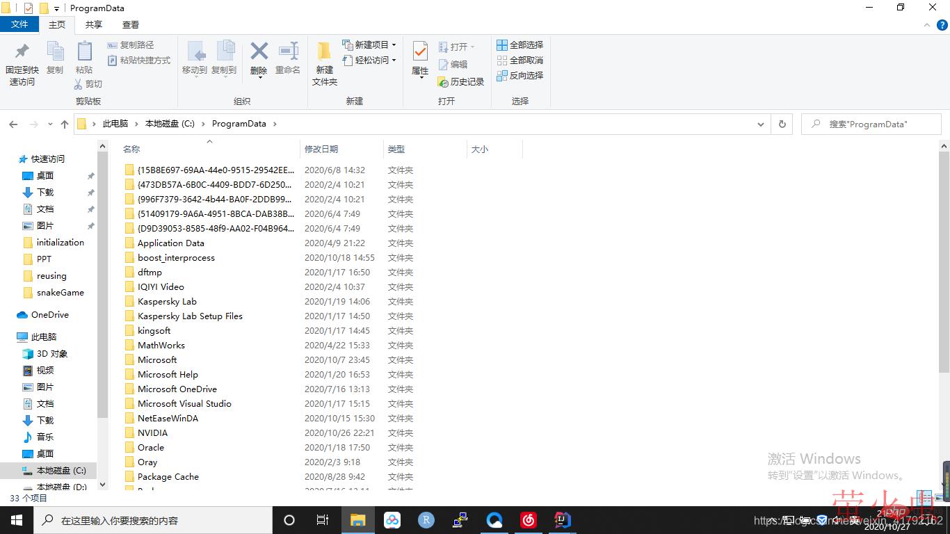 则说明文件夹ProgramData被隐藏了,这个时候有两种方法解决问题:
