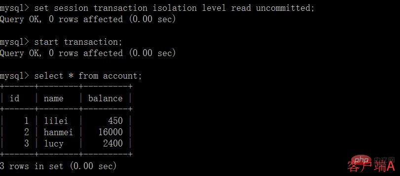 (1)打开一个客户端A,并设置当前事务模式为read uncommitted(未提交读),查询表account的初始值: