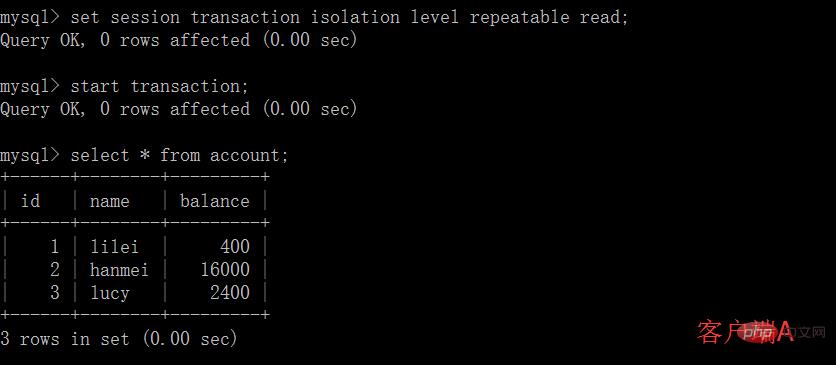 (1)打开一个客户端A,并设置当前事务模式为repeatable read,查询表account