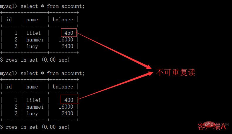 (5)客户端A执行与上一步相同的查询,结果 与上一步不一致,即产生了不可重复读的问题