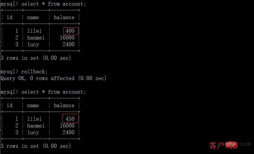 mysql> commit; Query OK, 0 rows affected (0.00 sec) mysql> select * from account; +------+--------+---------+ | id | name | balance | +------+--------+---------+ | 1 | lilei | 300 | | 2 | hanmei | 16000 | | 3 | lucy | 2400 | +------+--------+---------+ 3 rows in set (0.00 sec)