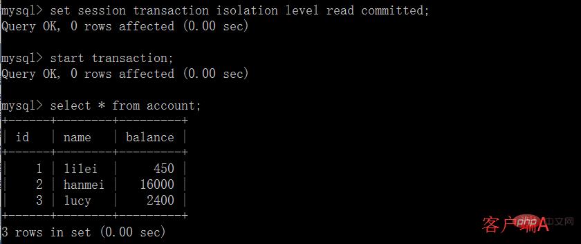 mysql> set session transaction isolation level serializable; Query OK, 0 rows affected (0.00 sec) mysql> start transaction; Query OK, 0 rows affected (0.00 sec) mysql> select * from account; +------+--------+---------+ | id | name | balance | +------+--------+---------+ | 1 | lilei | 10000 | | 2 | hanmei | 10000 | | 3 | lucy | 10000 | | 4 | lily | 10000 | +------+--------+---------+ 4 rows in set (0.00 sec)