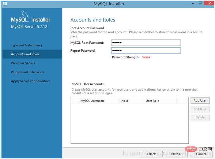 在这个页面的Root Account Password区域,我们设置的密码是Root Password,是一个管理员身份对应的密码。我们通常会在设置完该密码后直接点击Next,没有在下方区域点击“Add User”设置普通用户,这样一来就会导致我们在启动MySQL时容易忘记应该使用管理员权限启动MySQL。