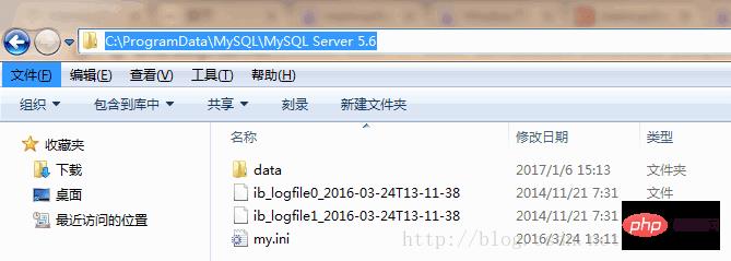 注意:ProgramData目录可能是“隐藏”的,如果在显示的分区中看不到的话就修改一下系统设置,让隐藏文件/文件夹可见。或者直接将ProgramData/MySQL/MySQL Server 5.6目录复制下来直接粘贴到文件夹的目录窗口中也可以。