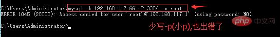 有的人写成mysql -h 192.168.117.66 -P 3306 -u root 注意:少写-p(小p),这种写法也出错了,如下图: