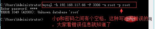 有的人写成mysql -h 192.168.117.66 -P 3306 -u root -p root 注意:小p和密码之间有个空格,这种写法是错误的,如下图: