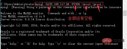 mysql -h 192.168.117.66 -P 3306 -u root -p或者mysql -h192.168.117.66 -P3306 -uroot -p如下图:小写字母p后面不写密码,这样的话,密码就不会显示暴露出来了,输入密码的时候也是显示成****