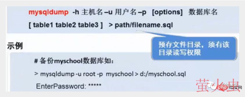 -- 导出 1. 导出一张表 -- mysqldump -uroot -p123456 school student >D:/a.sql mysqldump -u用户名 -p密码 库名 表名 > 文件名(D:/a.sql) 2. 导出多张表 -- mysqldump -uroot -p123456 school student result >D:/a.sql mysqldump -u用户名 -p密码 库名 表1 表2 表3 > 文件名(D:/a.sql) 3. 导出所有表 -- mysqldump -uroot -p123456 school >D:/a.sql mysqldump -u用户名 -p密码 库名 > 文件名(D:/a.sql) 4. 导出一个库 -- mysqldump -uroot -p123456 -B school >D:/a.sql mysqldump -u用户名 -p密码 -B 库名 > 文件名(D:/a.sql) 可以-w携带备份条件 -- 导入 1. 在登录mysql的情况下:-- source D:/a.sql source 备份文件 2. 在不登录的情况下 mysql -u用户名 -p密码 库名 < 备份文件
