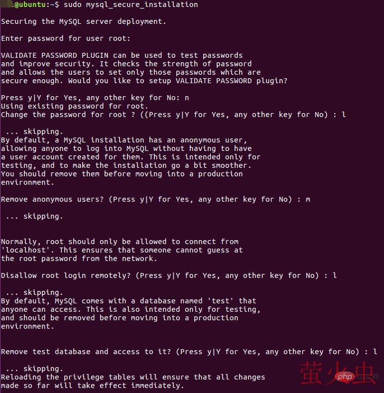 mysql_secure_installation会涉及是否修改root账号的密码、是否移除匿名用户、是否允许远程登录、是否删除test数据库等。