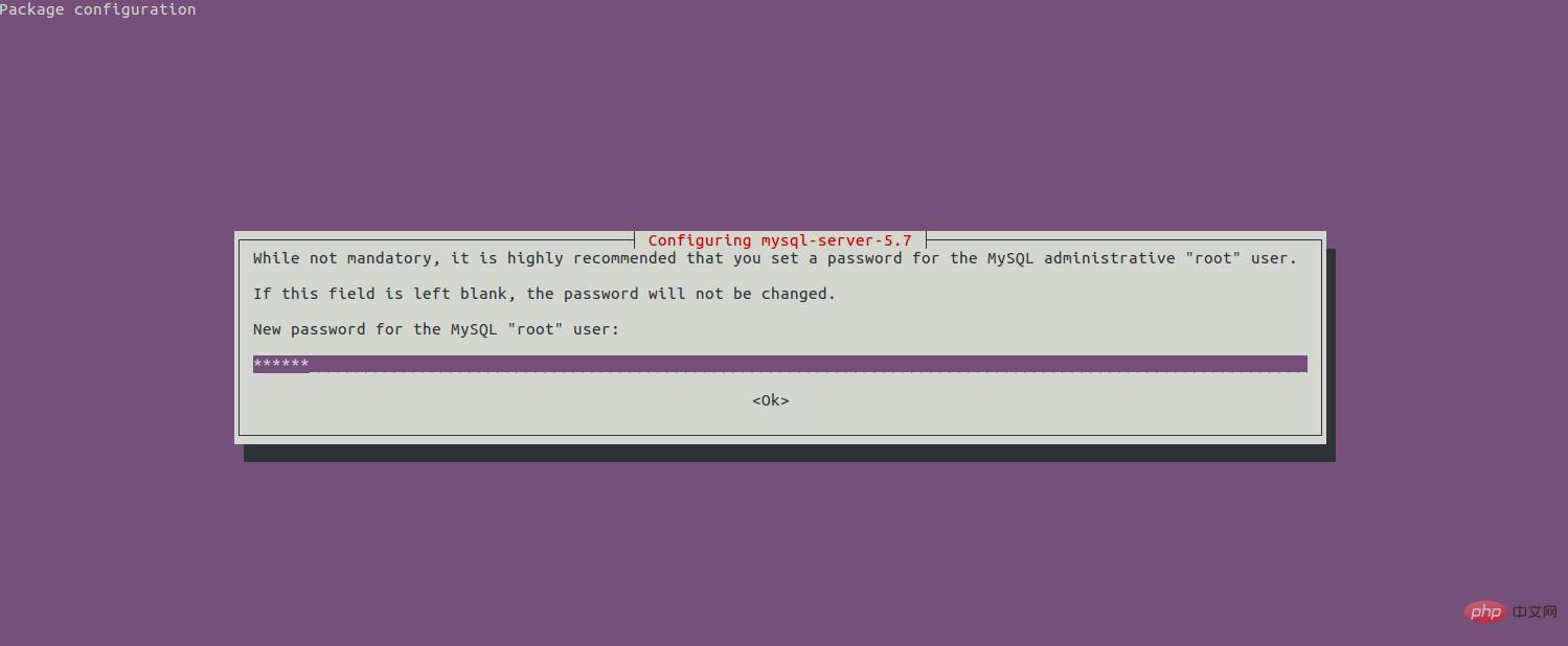 $ sudo apt-get install mysql-server mysql-client安装过程中会出现如下窗口,这里需要填写MySQL的root账号的密码,并确认