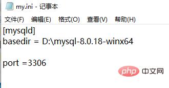 [mysqld] basedir = D:\mysql-8.0.18-winx64 datadir = D:\data port =3306