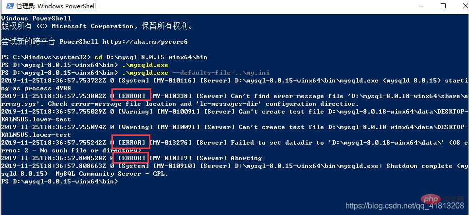 在前面的基础上 将my.ini删除,这样mysqld就找不到数据源,看下它提示了什么错误