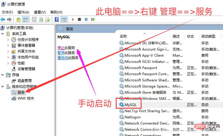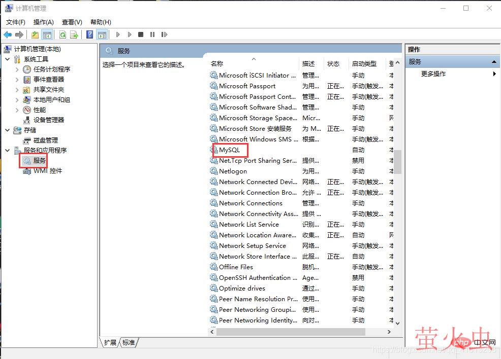 那么先检查一下服务里面有没有mysql服务 此电脑==》管理==》服务和应用程序==》服务 如下图
