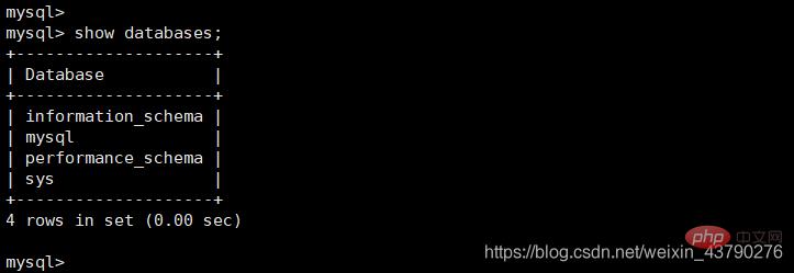 使用 show databases; 查看当前安装的 MySQL 中有哪些数据库。