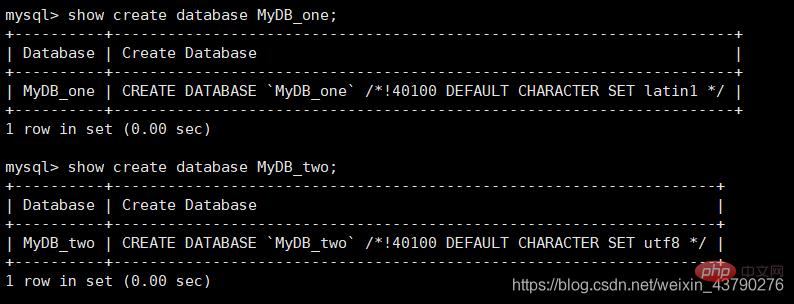 如果不知道一个数据库的编码方式是什么,可以使用 show create database 数据库名 来查看数据库的编码方式。可以看到刚才创建的 MyDB_one 的编码方式是 MySQL 的默认编码 latin1 ,MyDB_two 的编码方式是 utf-8 。