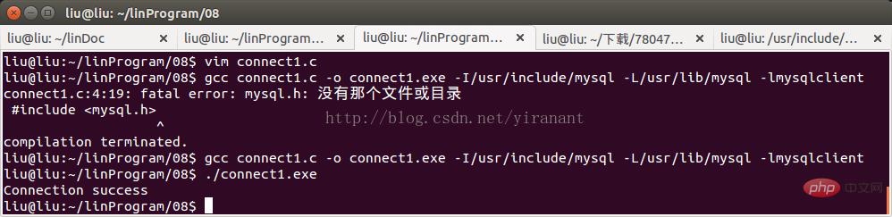 编写C语言程序connect1.c与MySQL数据库建立连接,在命令行输入:gcc connect1.c -o connect1.exe -I/usr/include/mysql -L/usr/lib/mysql -lmysqlclient