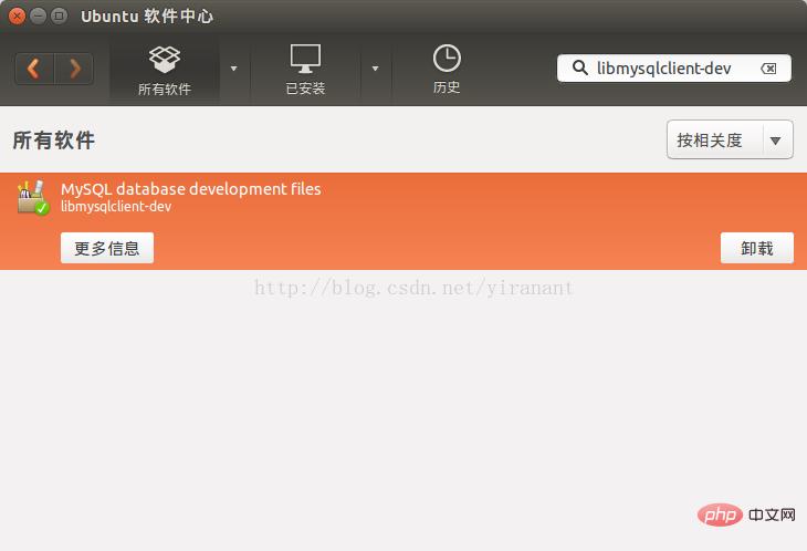 1.图形界面操作:直接在软件中心输入MySQL database development files或者libmysqlclient-dev,点击安装.(如图2所示)
