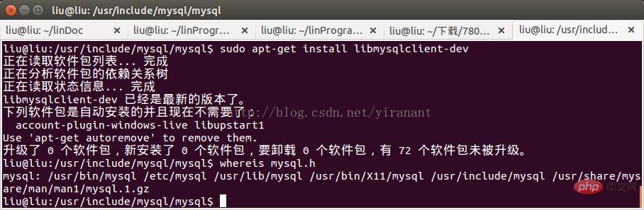 2.命令行下:输入sudo apt-get install libmysqlclient-dev,输入密码(如图3所示),安装完成后输入whereis mysql.h则出现/usr/include/mysql,说明mysql.h可以被使用.