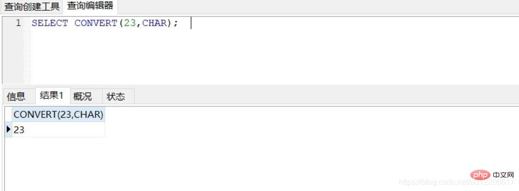 SELECT CONVERT(23,CHAR);运行结果如下图所示。