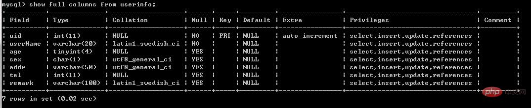 d、show full columns from 表名; ---可以查看该表格字段的属性