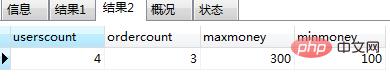 select userscount,ordercount,maxmoney,minmoney; -- 返回最金额、最小金额