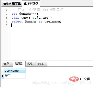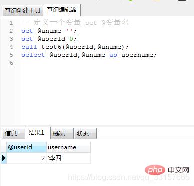 create procedure test2() begin -- 使用 declare语句声明一个变量 declare username varchar(32) default ''; -- 使用set语句给变量赋值 set username='xiaoxiao'; -- 将users表中id=1的名称赋值给username select name into username from users where id=1; -- 返回变量 select username; end;