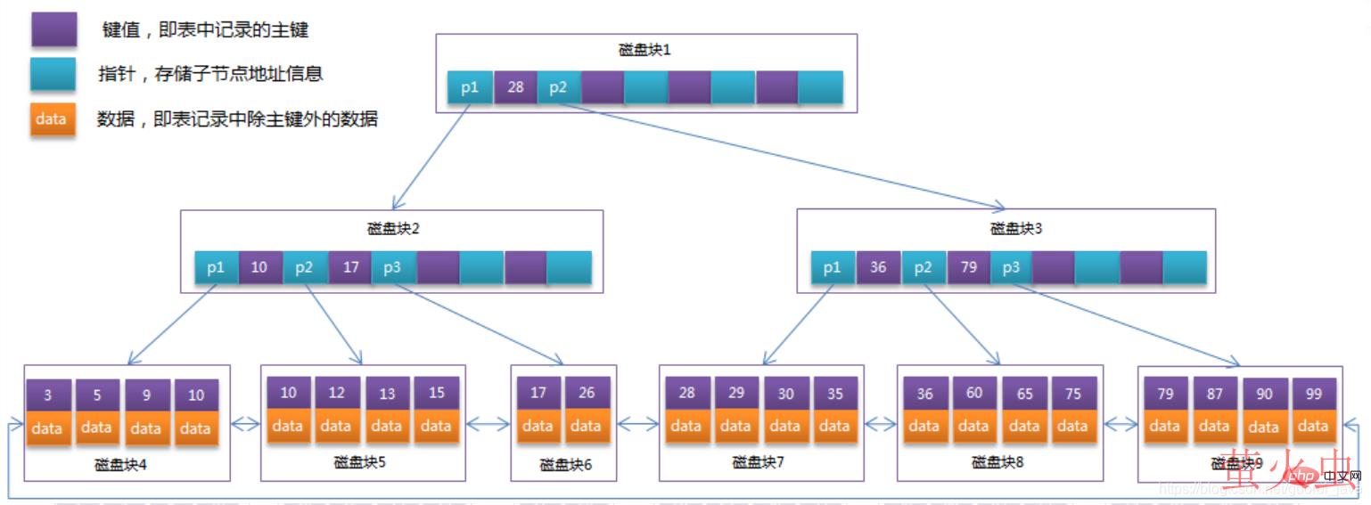 B-Tree结构图中每个节点中不仅包含数据的key值,还有data值。而每一个页的存储空间是有限的,如果data数据较大时将会导致每个节点(即一个页)能存储的key的数量很小,当存储的数据量很大时同样会导致B-Tree的深度较大,增大查询时的磁盘I/O次数,进而影响查询效率。在B+Tree中,所有数据记录节点都是按照键值大小顺序存放在同一层的叶子节点上,而非叶子节点上只存储key值信息,这样可以大大加大每个节点存储的key值数量,降低B+Tree的高度。