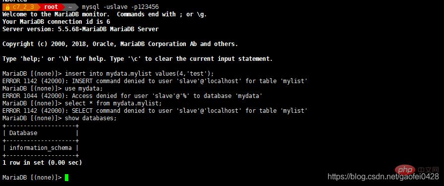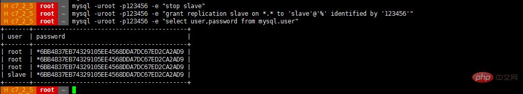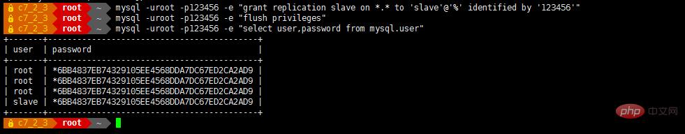 mysql -uroot -p123456 -e "grant replication slave on *.* to 'slave'@'%' identified by '123456'"