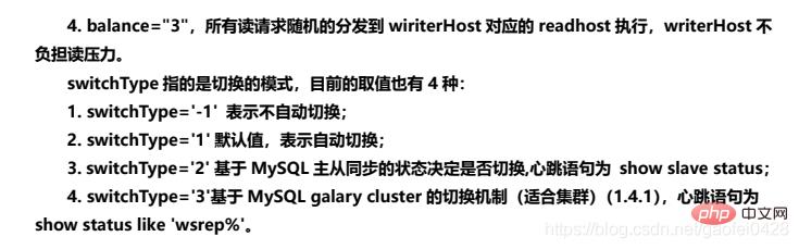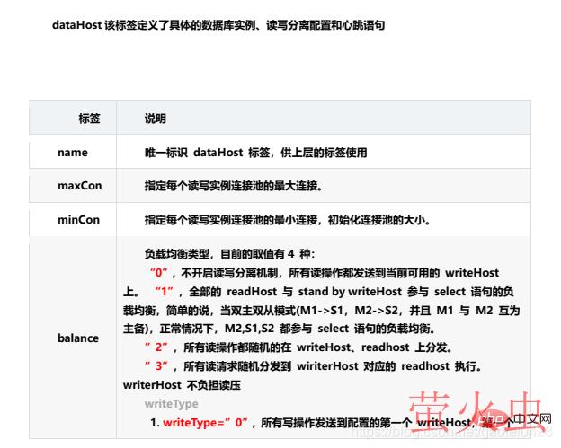 <dataHost name="dthost" maxCon="500" minCon="10" balance="1" writeType="0" dbType="mysql" dbDriver="native" switchType="-1" slaveThreshold="100">
