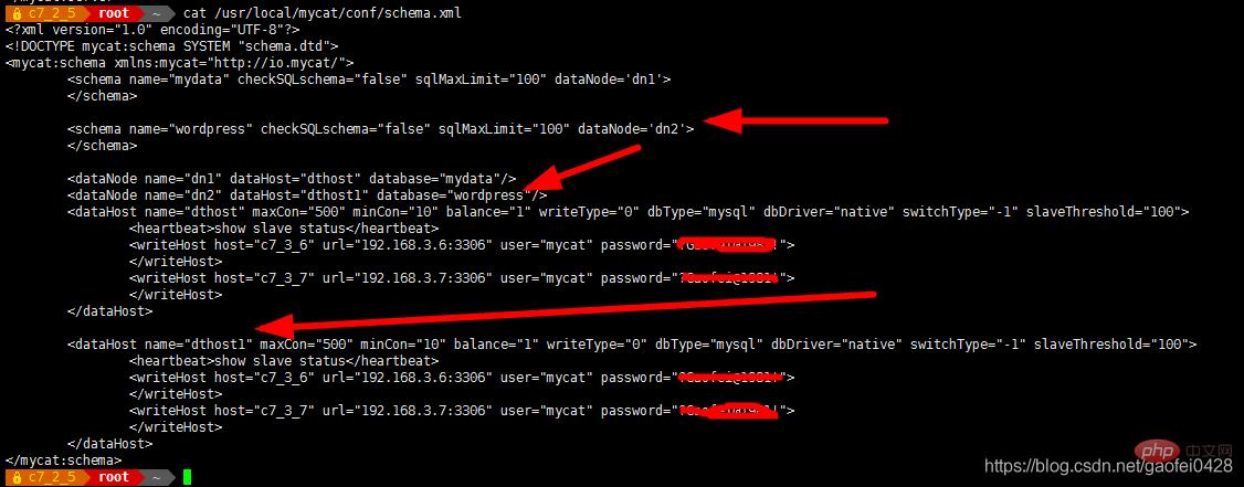 - <schema name="wordpress" checkSQLschema="false" sqlMaxLimit="100" dataNode='dn2'>