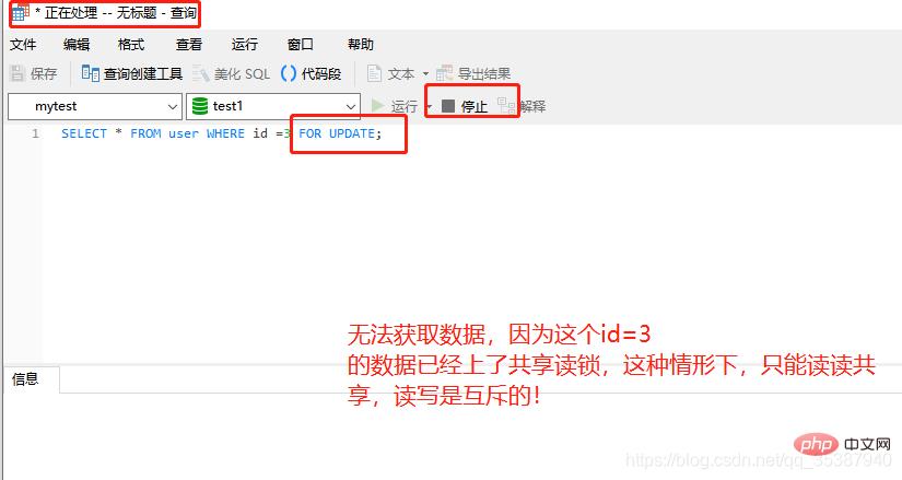 3.那么也是基于当前情况,我们再执行一下使用排他写锁的查询语句,可以发现 读写互斥了: