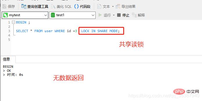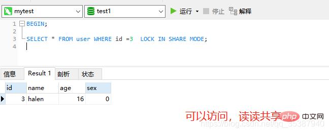 select * from table(表) lock in share mode ;上行级共享锁,也就是行级共享读锁: