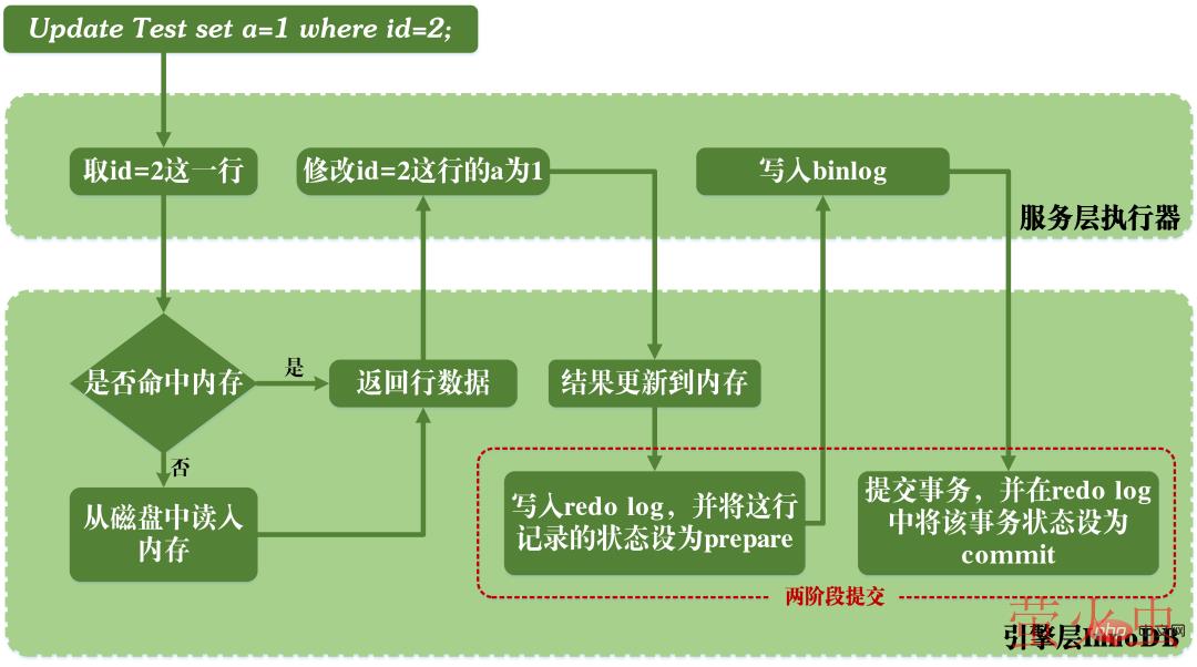从上图可以看出,MySQL在执行更新语句的时候,在服务层进行语句的解析和执行,在引擎层进行数据的提取和存储;同时在服务层对binlog进行写入,在InnoDB内进行redo log的写入。