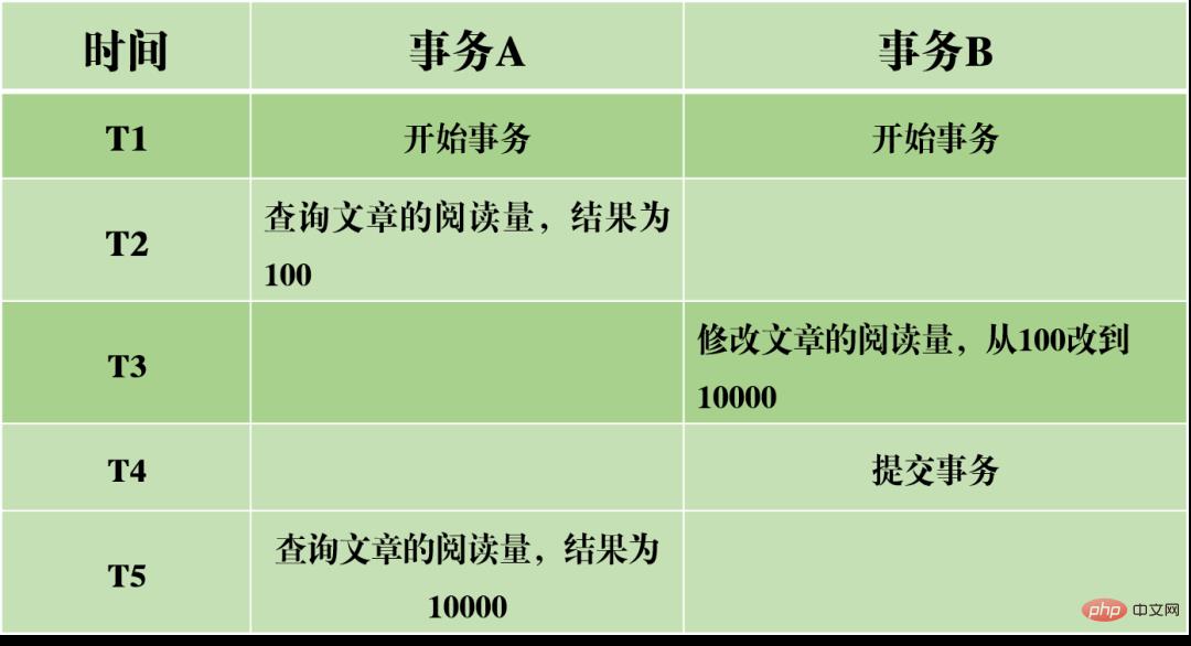 以上图为例,事务A在先后读取文章阅读量的数据时,结果却不一样。说明事务A在执行的过程中,阅读量的值被其它事务给修改了。这样使得数据的查询结果不再可靠,同样也不合实际。