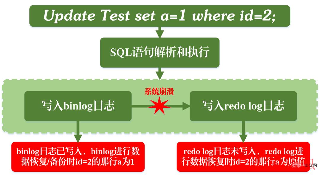 在写完redo log之后,数据此时具有crash-safe能力,因此系统崩溃,数据会恢复成事务开始之前的状态。但是,若在redo log写完时候,binlog写入之前,系统发生了宕机。此时binlog没有对上面的更新语句进行保存,导致当使用binlog进行数据库的备份或者恢复时,就少了上述的更新语句。从而使得id=2这一行的数据没有被更新。