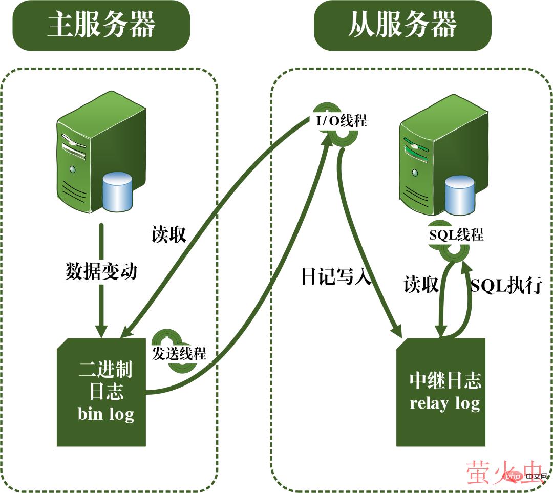 主从复制的过程可见下图。主从复制的过程主要是靠三个线程进行的,一个运行在主服务器中的发送线程,用于发送binlog日志到从服务器。两外两个运行在从服务器上的I/O线程和SQL线程。I/O线程用于读取主服务器发送过来的binlog日志内容,并拷贝到本地的中继日志中。SQL线程用于读取中继日志中关于数据更新的SQL语句并执行,从而实现主从库的数据一致。
