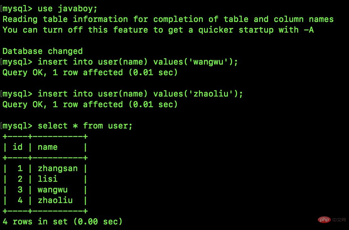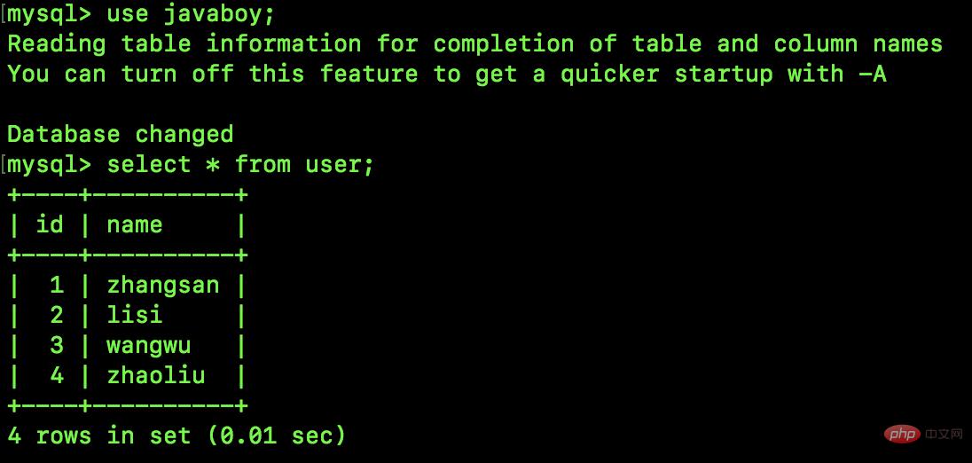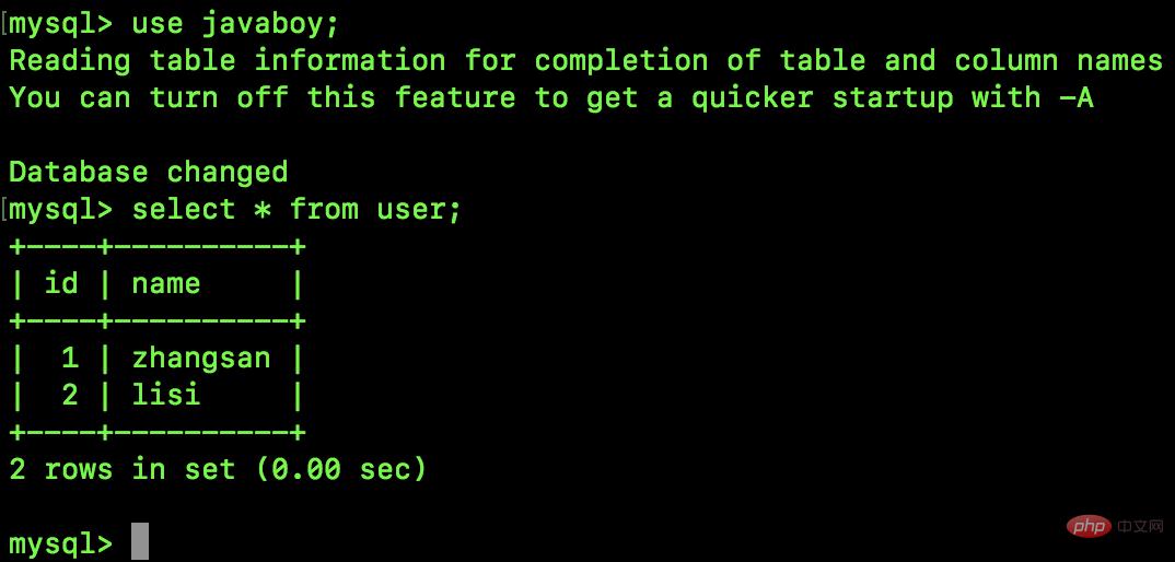 这是一个新安装的数据库,里边我新建了一个数据库名为 javaboy,javaboy 库中新建了一张表名为 user,user 中有两条记录,如下: