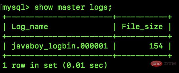 可以看到,我这里目前只有一个日志文件,文件名为 javaboy_logbin.000001,File_size 表示这个文件占用的字节大小是 154。
