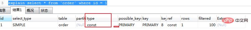 如果type是const,说明在进行数据查询的时候,命中了primary key或唯一索引,此类数据查询速度非常快。