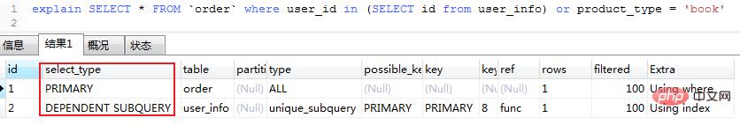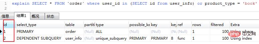 如上图所示,SQL查询语句中,第一个执行计划的id为1,第二个执行计划的id为2,id为1的执行计划对应的table为order,id为2的执行计划对应的table是user_info,结合SQL语句,我们知道先执行子查询select id from user_info,而后再执行关于表order的数据查询。