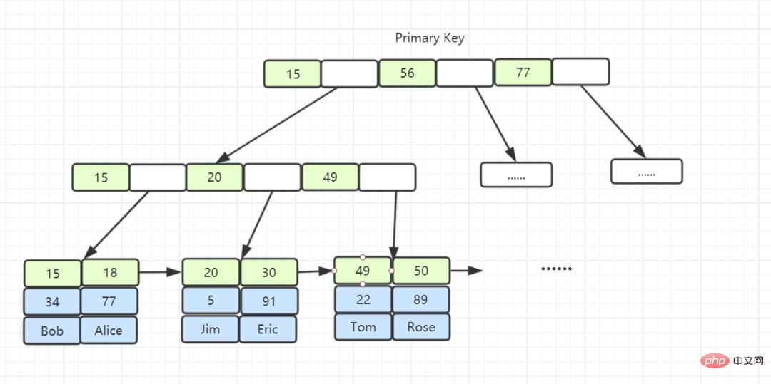 - B+树所有的数据行都存储在叶节点中,而这些叶节点可以通过『指针』依次按顺序连接,当我们在如下所示的 B+ 树遍历数据时可以直接在多个子节点之间进行跳转,这样能够节省大量的磁盘 I/O 时间。