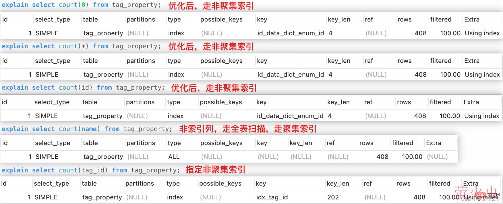 count(非索引列)来说,优化器选择全表扫描,说明只能在聚集索引的叶子结点顺序扫描。 count(二级索引列)只能选择包含我们指定的列的索引去执行查询,可能导致优化器选择的索引执行的代价并不是最小。