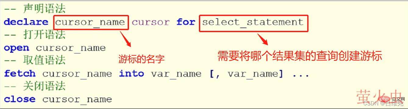 -- select var_empno,var_ename,var_sal; -- 注意:以上两句只可以获取一个数据,因为游标是一次一行,所以采用循环