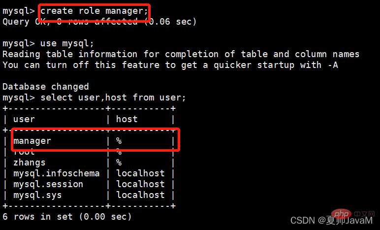 CREATE ROLE 'manager'@'localhost';效果如下图