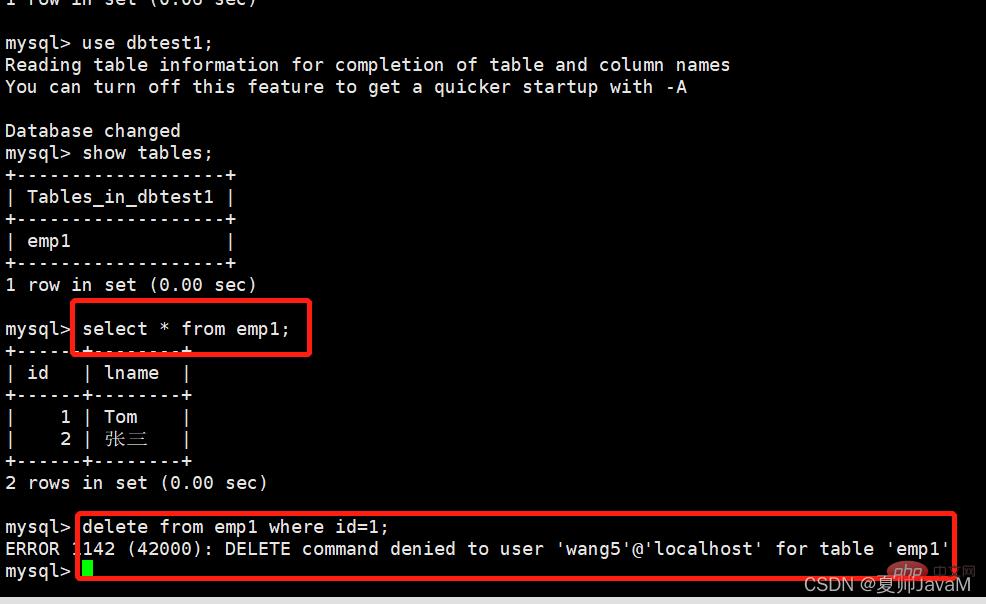 那么现在wang5已经被赋予manager角色,我们知道manager角色只是有select的权限。我们做如下操作